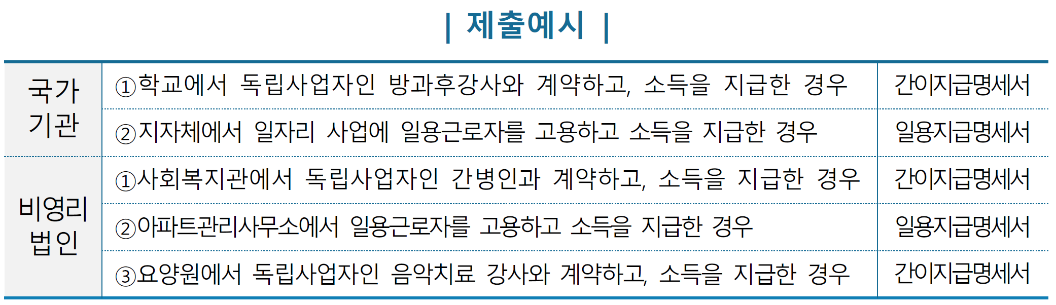 - 특히, 일용근로자나 인적용역 사업자에게 소득을 지급한 국가기관, 비영리법인 등도 제출의무자에 포함되니, 유의