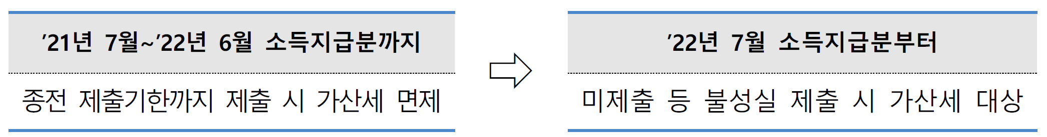 - 다만, ’22년 7월 소득지급분부터는 매달 제출하지 않는 경우 가산세 대상이므로 미리 준비하시기 바랍니다.