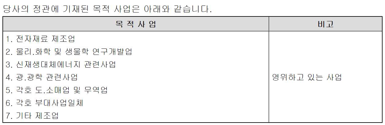 회사는 나노소재 관련 전자재료용 나노무기소재, 나노금속화합물, 나노유기형광체의 기초연구를 바탕으로 나노신소재 개발 및 제조업을 주요 사업으로 영위하고 있습니다.