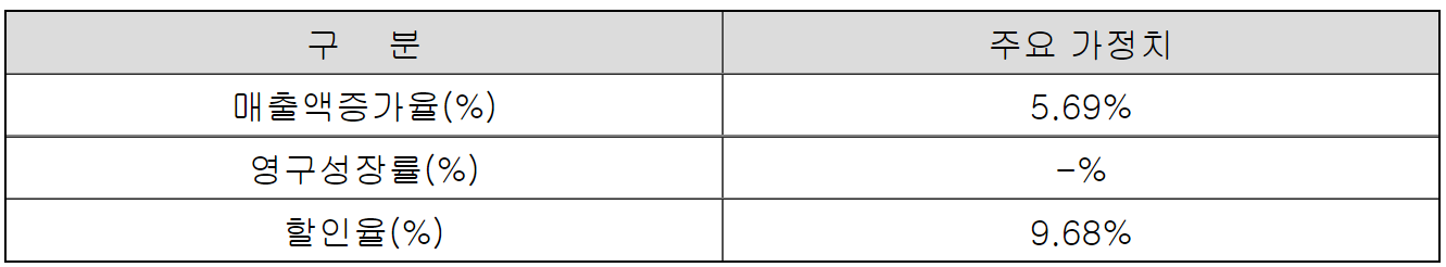 매출액증가율은 향후 5년의 예측 기간에 대한 연평균 증가율입니다. 이는 과거 실적과 시장 개발에 대한 경영진의 기대에 기초합니다. 당기말 경영진이 승인한 예산을 근거로 한 미래예상현금흐름으로 산출된 현금창출단위의 사용가치는 51,425백만원 입니다.