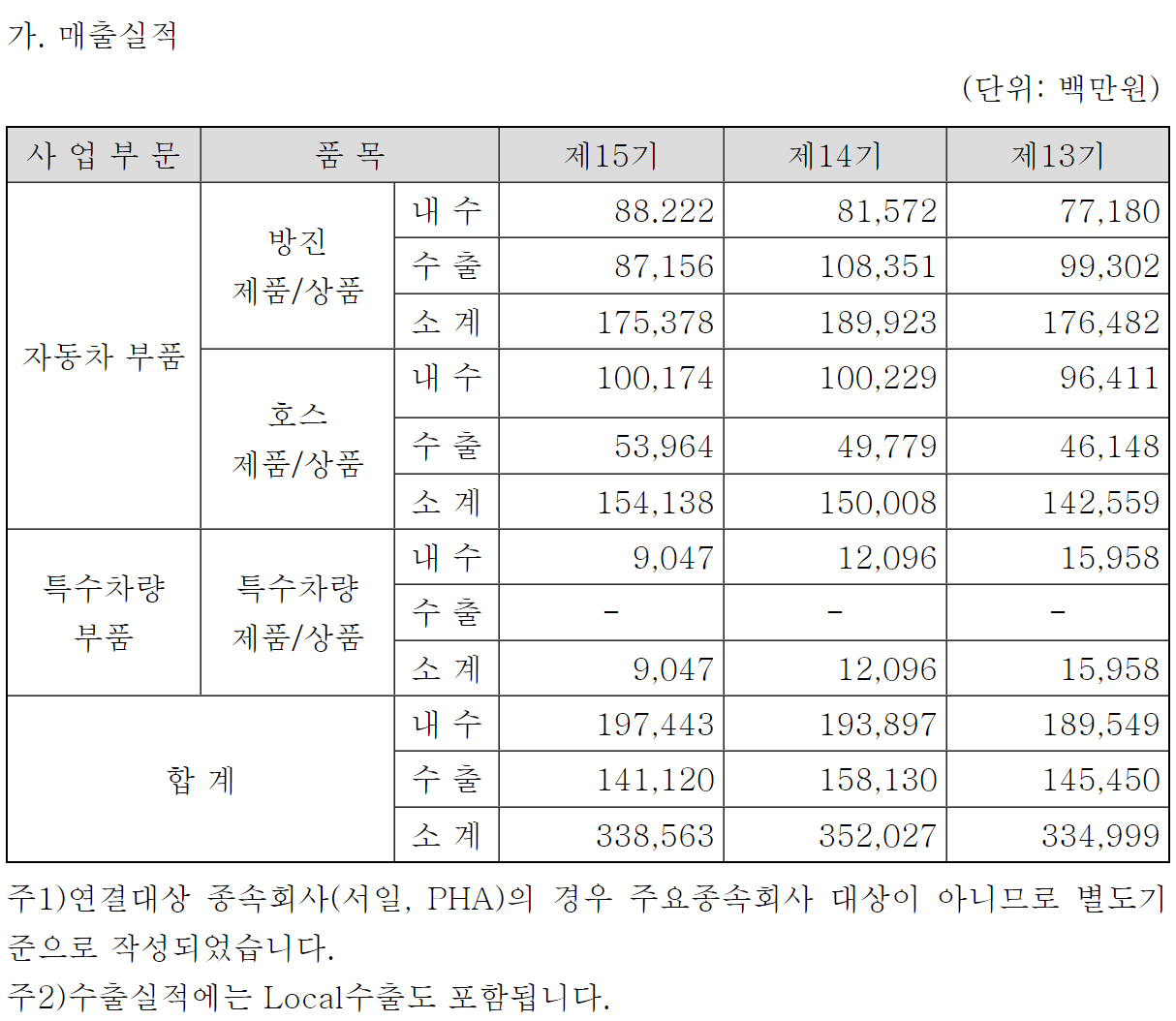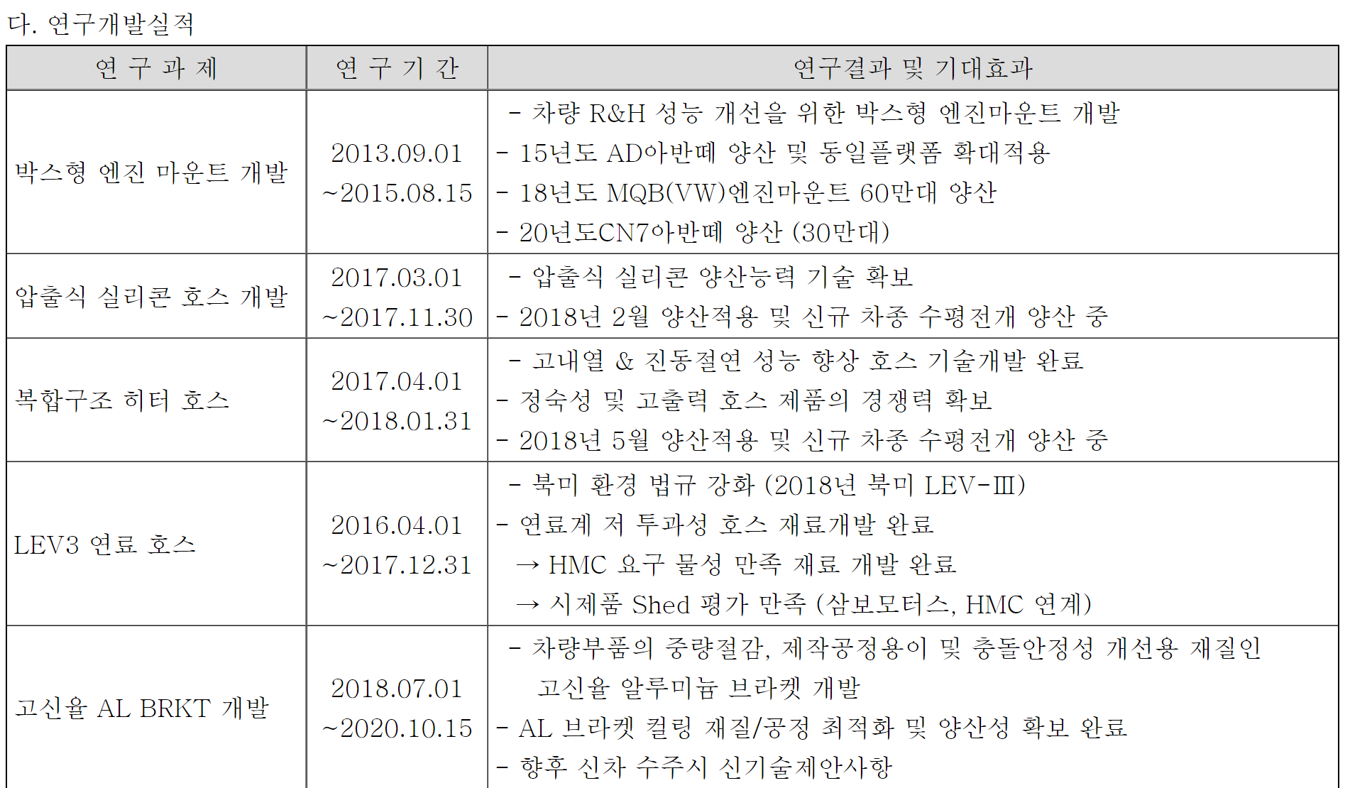 회사는 방진 및 호스 자동차 부품을 생산하여 국내 완성차 메이커인 현대차, 기아차, 한국GM, 쌍용차에 중점 판매하고 있으며, 미국, 중국, 인도의 자회사 및 계열사를 통해 해외시장 제품공급에 대응하고 있습니다. 또한 독자적인 기술연구소를 설립하여 운영하고 있으며, 우수 연구인력이 신기술, 재료배합기술 등에 매진하고 있습니다. 방진 및 호스부품 제조 기술부문에 있어서는 현대, 기아차의 기술평가 최고등급인 기술 5스타 획득하는 등 그 기술력을 인정받고 있습니다.