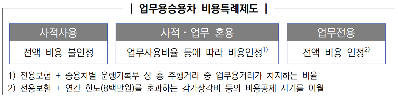 - 제도 도입 전에도 법인 임직원 및 개인사업자가 업무에 사용하지 않은 차량과 관련된 취득⋅유지비 등은 세법상 비용으로 인정되지 않았으나,