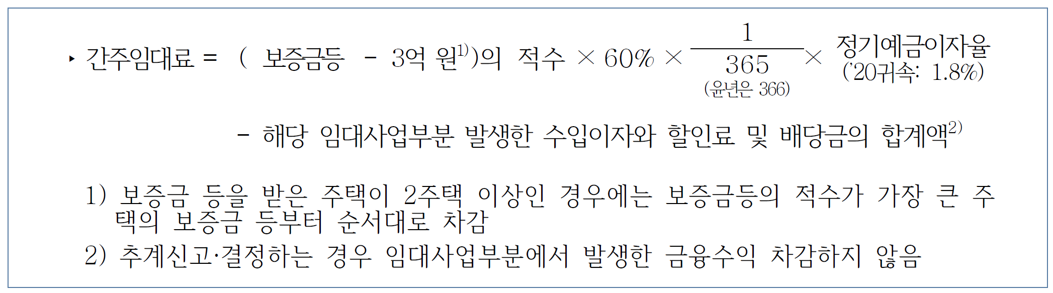월세 임대료를 받는 임대사업자와의 과세형평성을 위해 보증금 등에 대해서는 정기예금이자율(ʼ20년 귀속 1.8%)에 해당하는 금액만큼은 임대료로 간주합니다. 다만, 주택의 경우 부부 합산 3주택 이상 소유자에 대해서만 과세하고, 보증금 등에서 3억 원을 차감한 금액의 60%에 대해 과세합니다.
